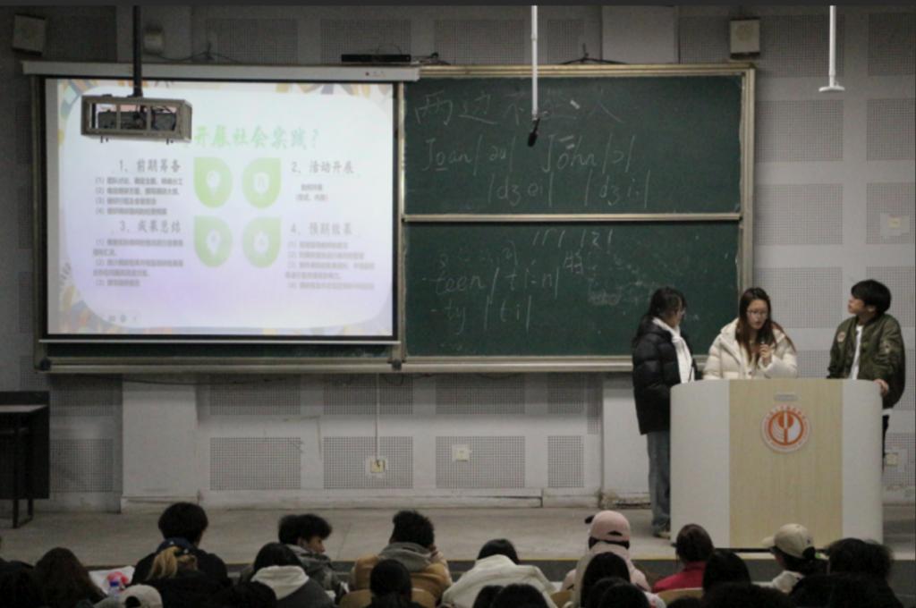 (图为王健宇、宋冠宁、殷晓涵为同学们介绍社会实践过程)