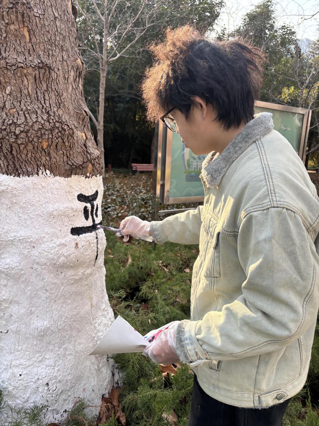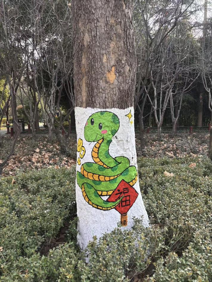 创作中,同学们分工协作、默契配合,在树干上逐步勾勒出雏鸡、青蛇等十二生肖的鲜活形象,还与现场路人交流创作思路,让艺术创作成为与大众互动的美好体验。同时,大家在涂鸦创作中注重树木保护,选用环保颜料、把控绘画力度,将环保理念与艺术创作深度融合,让这份“自然艺术”兼具美感与环保意义。