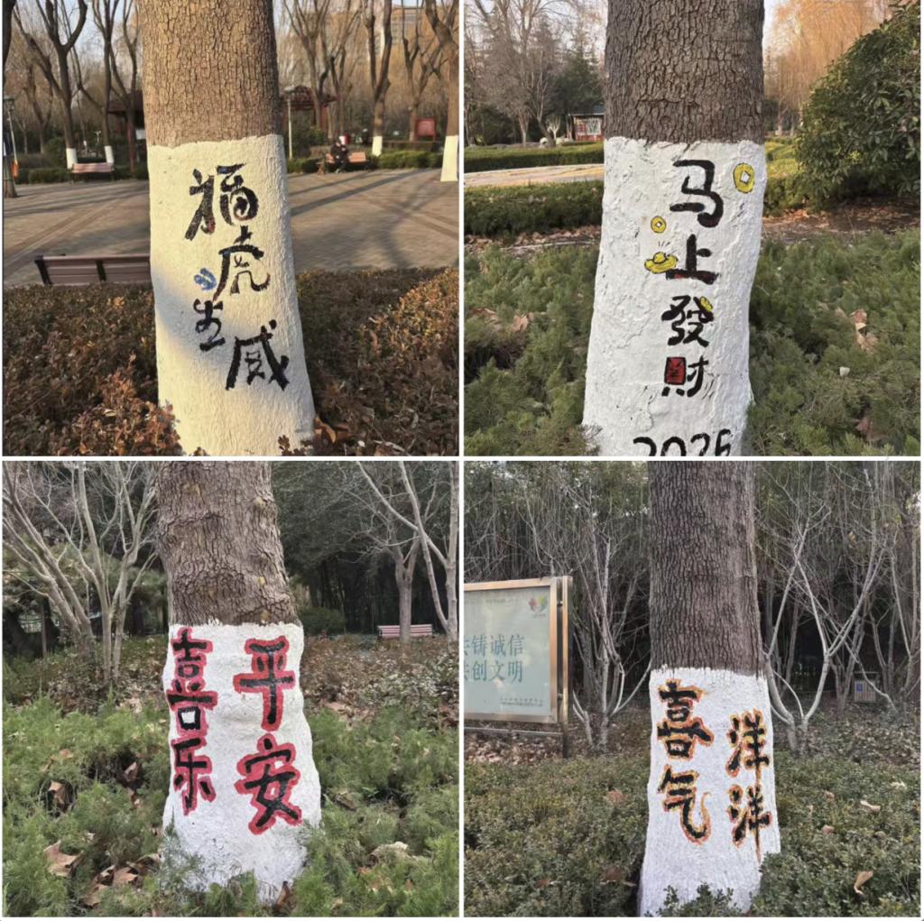为让艺术融入自然、为冬日公园增添生机与趣味,造型艺术学院联合济南市公园发展服务中心组织学生党员、学生干部为主体的志愿者走进花圃公园,开展以“十二生肖”为主题的树木涂鸦创作活动。学生们以树干为画布,将生肖形象、萌趣图案与创意相结合,用斑斓色彩为原本单调的树干披上独特的“艺术外衣”。