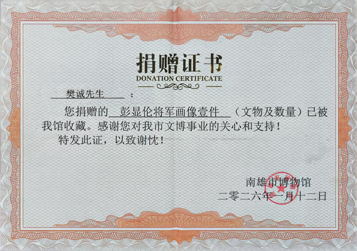 南雄市委副书记林军同志接受了彭显伦将军画像捐赠,并给我和樊诚老师颁发了捐赠证书。在我的提议下,南雄革命历史博物馆表示,他们将制作两份复制品,一份送还给山东工艺美术学院,一份在博物馆展台公开展出,让更多人观看,真迹将在馆中永久收藏。这幅画得到了最好的归宿,也象征着父亲魂归故里、叶落归根了!